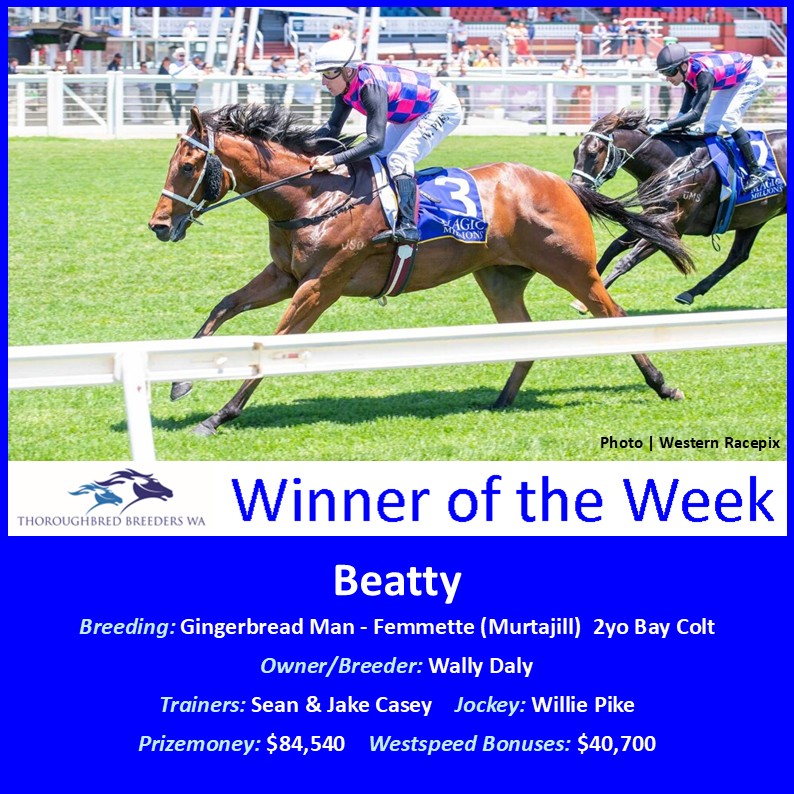Gingerbread Man sired him from Femmette (Murtajill) who won a Westspeed 2YO Plate at Ascot and she foaled another Gingerbread Man colt in August.  Femmette’s half-brother Charleton Eddie (Shooting To Win) was a black-type performer in Daly’s Hot Pink and Royal Blue checked silks as was second-dam Refemme (Surtee) who won the LR Gimcrack Stakes (1100m) in 2004.