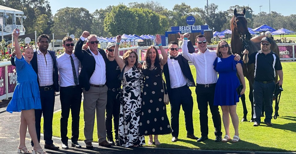 Our Paladin Al’s winning owners celebrate his victory in the Westspeed Platinum Sprint / Photo: Western Racepix