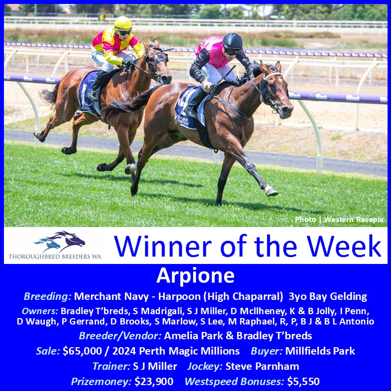 Arpione was bred and sold for $65,000 at the 2024 Perth Magic Millions by Peter Walsh (Amelia Park) and Brian Bradley (Bradley Thoroughbreds). He’s a half-brother to She’s Fit (G3 WA Oaks) and their dam Harpoon is a half-sister to Special Harmony (G1 VRC Oaks), King Canute (G2 Perth Cup) and Redwoldt (G2 Karrakatta Plate).