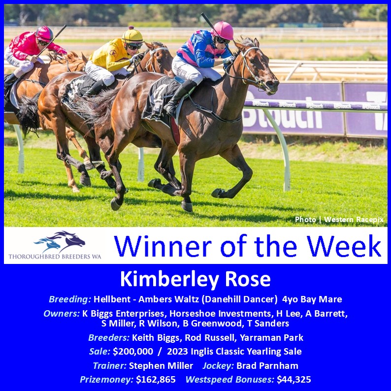 Kimberley Rose is by sprint stallion Hellbent (I Am Invincible) who has yet to sire a winner past 2200m in his first five crops at Yarraman Park, however, there’s staying blood further back on the bottom-half of her pedigree through the successful ‘Amber’ family that was nurtured by John Nicolay when he was a Perth Racing committeeman.