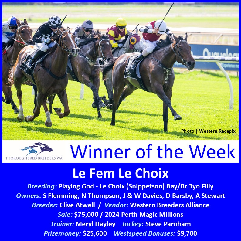 Le Fem Le Choix was Hayley’s third city winner in as many days following Maalis Song (Your Song) at Ascot and Golden Chatter (I’m All The Talk) at Belmont.  And she joins a Playing God 3yo fillies division that includes LR Burgess Queen Stakes (1400m) winner Playin’it Sweet and Wednesday’s G3 WA Oaks (2400m) winner Wonderfully Made.